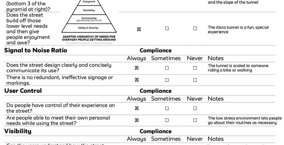 To survey the experience and usability of street infrastructure, we can use a heuristic evaluation. A heuristic evaluation uses established design principles that measure how easy and pleasant something is to use ("usable"). A heuristic evaluation should be done by actually trying out the infrastructure and observing others use it. Multiple people with different perspectives conducting the evaluation yields more robust results. Below is a heuristic evaluation of the disco tunnel.